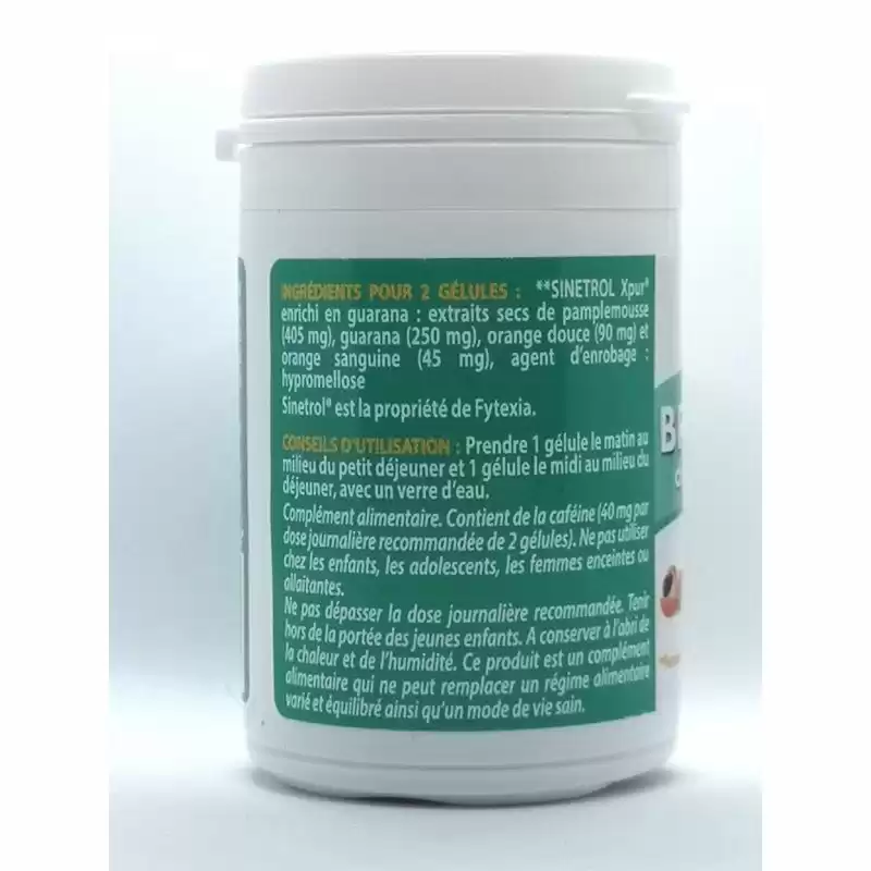 Contient de la caféine (40 mg par dose journalière recommandée de 2 gélules). Ne pas utiliser chez les enfants, les adolescents, les femmes enceintes ou allaitantes.